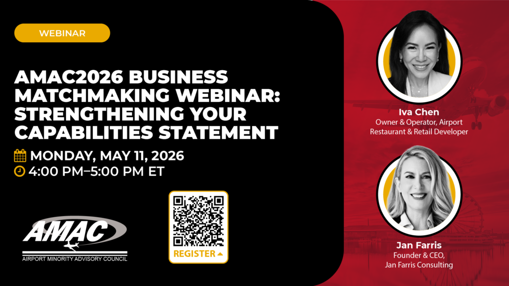 Participants will receive a first look at the 2026 AMAC Airport Business Conference—this year’s must-attend industry event. We will provide an overview of the AMAC2026 agenda, exhibit/sponsorship opportunities, key events and more!