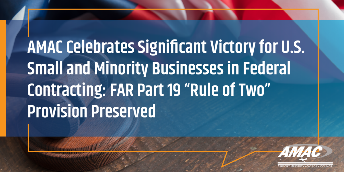 Washington, DC (December 10, 2025) — The Airport Minority Advisory Council (AMAC) celebrates a significant victory for America’s small and minority businesses in federal contracting. After months of uncertainty, the recently released rewrite to the Federal Acquisition Regulation Council (FAR Council) Part 19 confirms that the Rule of Two provision has been preserved. The Rule of Two is a statutory requirement that mandates set-asides for small businesses when at least two responsible small business concerns are expected to submit offers at fair market … Read More