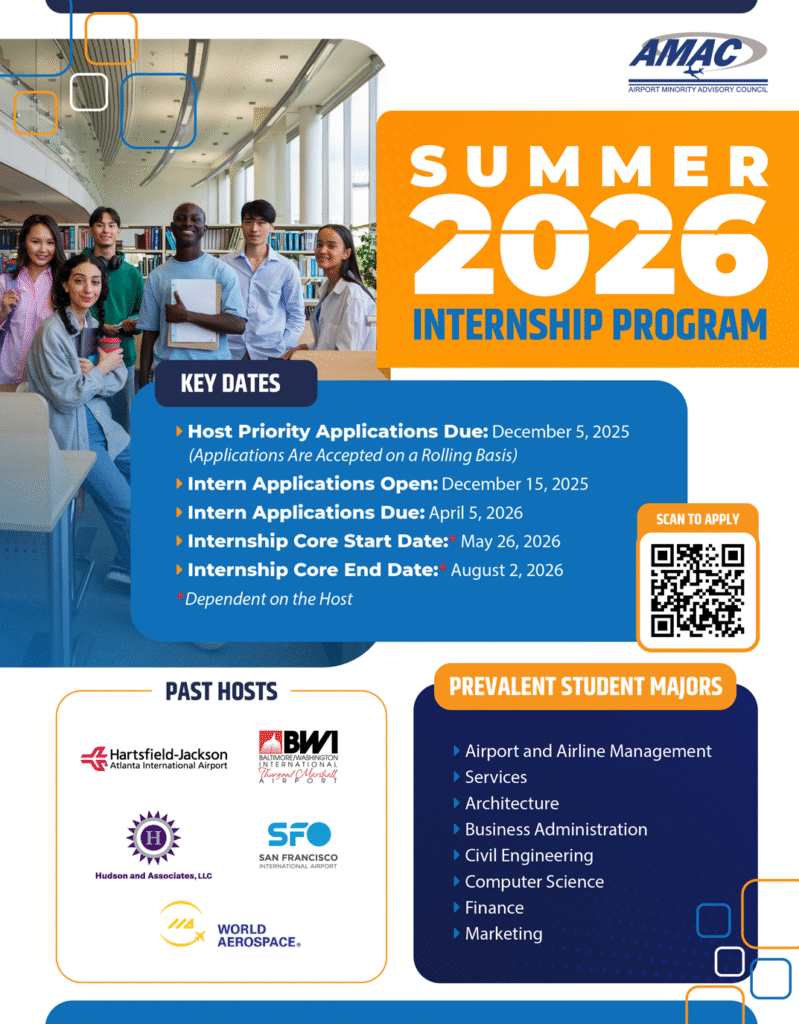 Are you a student who’s interested in learning about airport management careers, building airports or operating a business in airports? Are you an airport or company that would like to host interns? AMAC’s 10-week virtual or in-person program gives students a well-rounded introduction to the airport ecosystem.