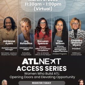 Women Who Build ATL: Opening Doors and Elevating Opportunity is a dynamic virtual forum designed for women, by women, and led by women across the construction and infrastructure industries. This powerful session will connect women-owned and women-led firms directly to real opportunities at Hartsfield-Jackson Atlanta International Airport (ATL), one of the largest aviation capital programs in the nation. Whether you are a contractor, subcontractor, project manager, architect, engineer, supplier, consultant, or professional service provider supporting construction and infrastructure, this session …