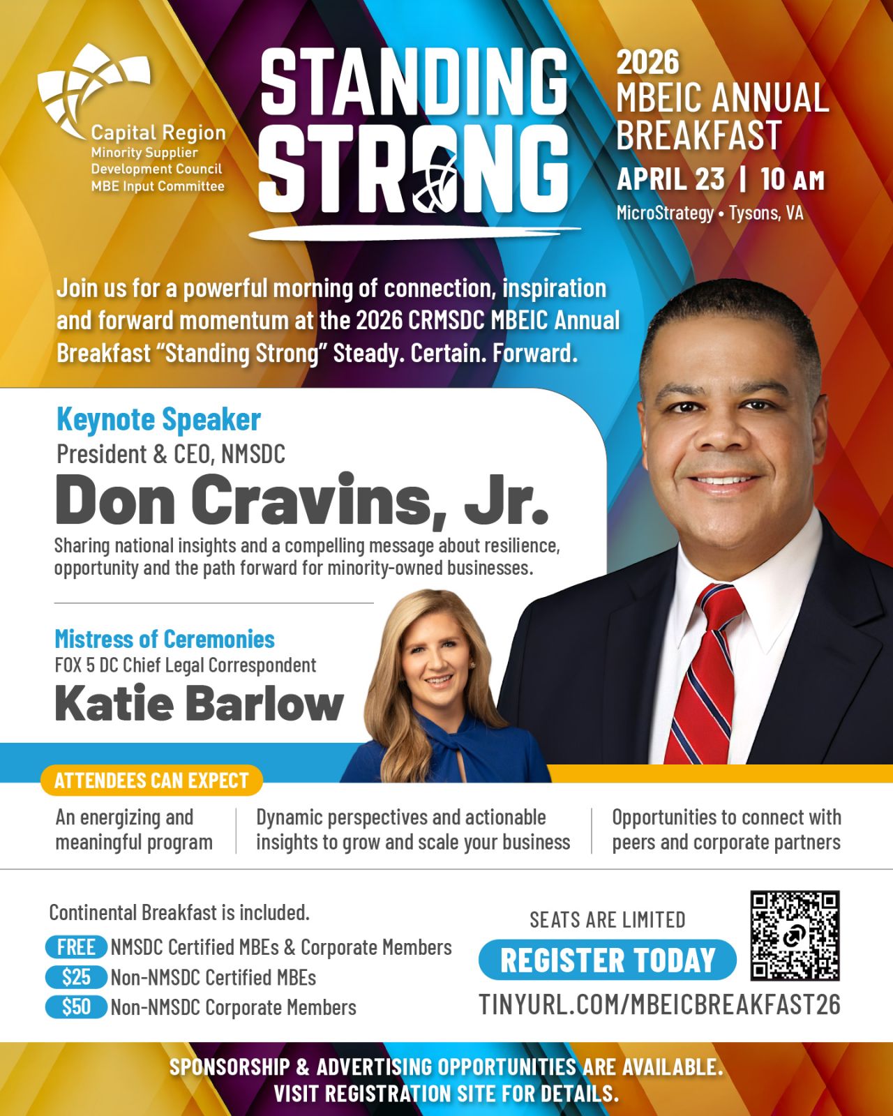 The CRMSDC Minority Business Enterprise Input Committee (MBEIC) Annual Breakfast is where the Capital Region’s supplier diversity community comes together—corporate leaders, procurement decision-makers, certified MBEs, and small businesses all in one room, building relationships that continue long after the program ends.