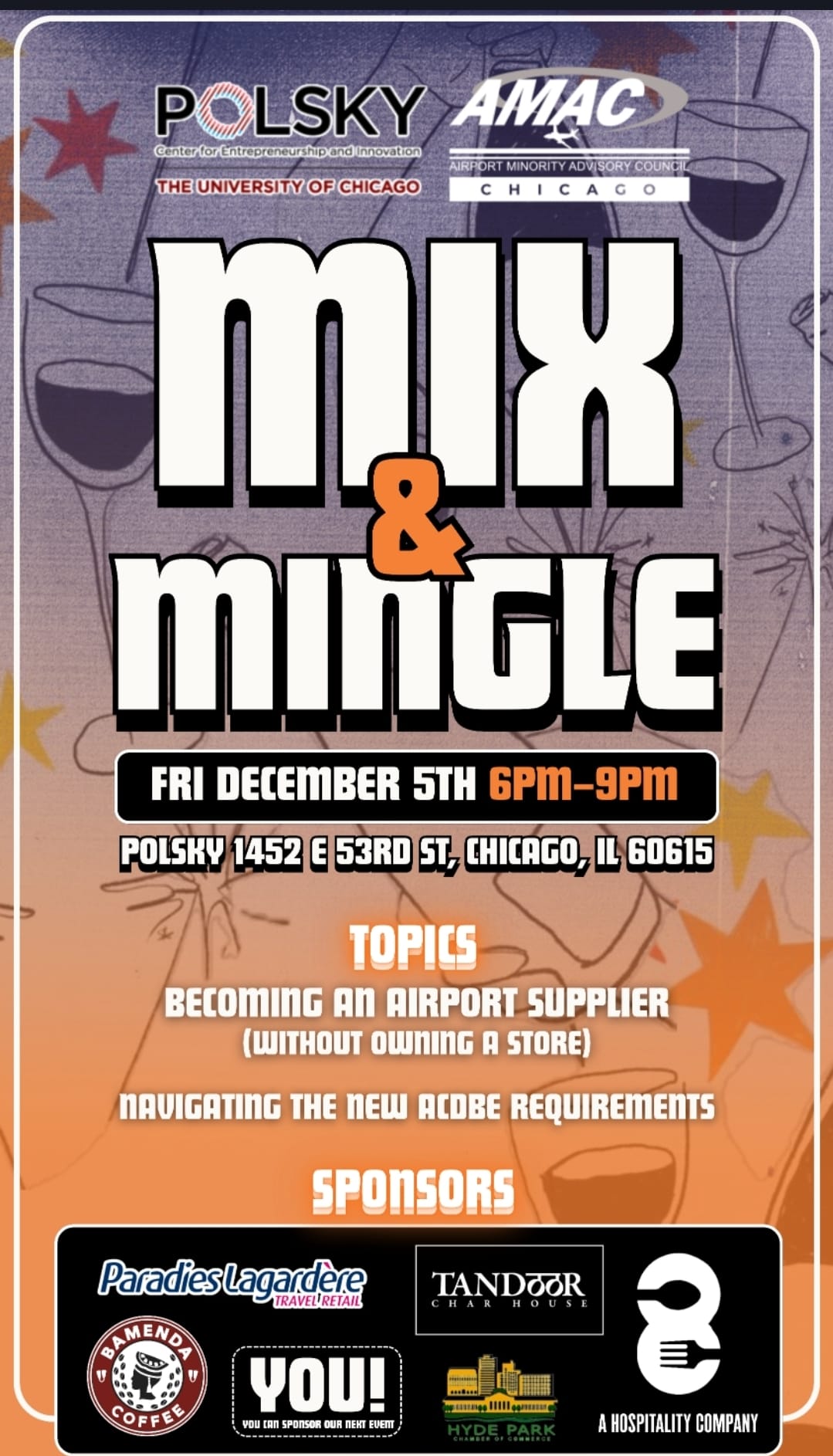 AMAC Chicago Chapter – Mix & Mingle. Topics include Becoming an Airport Supplier (without owning a store) and Navigating the new ACDBE Requirements.
