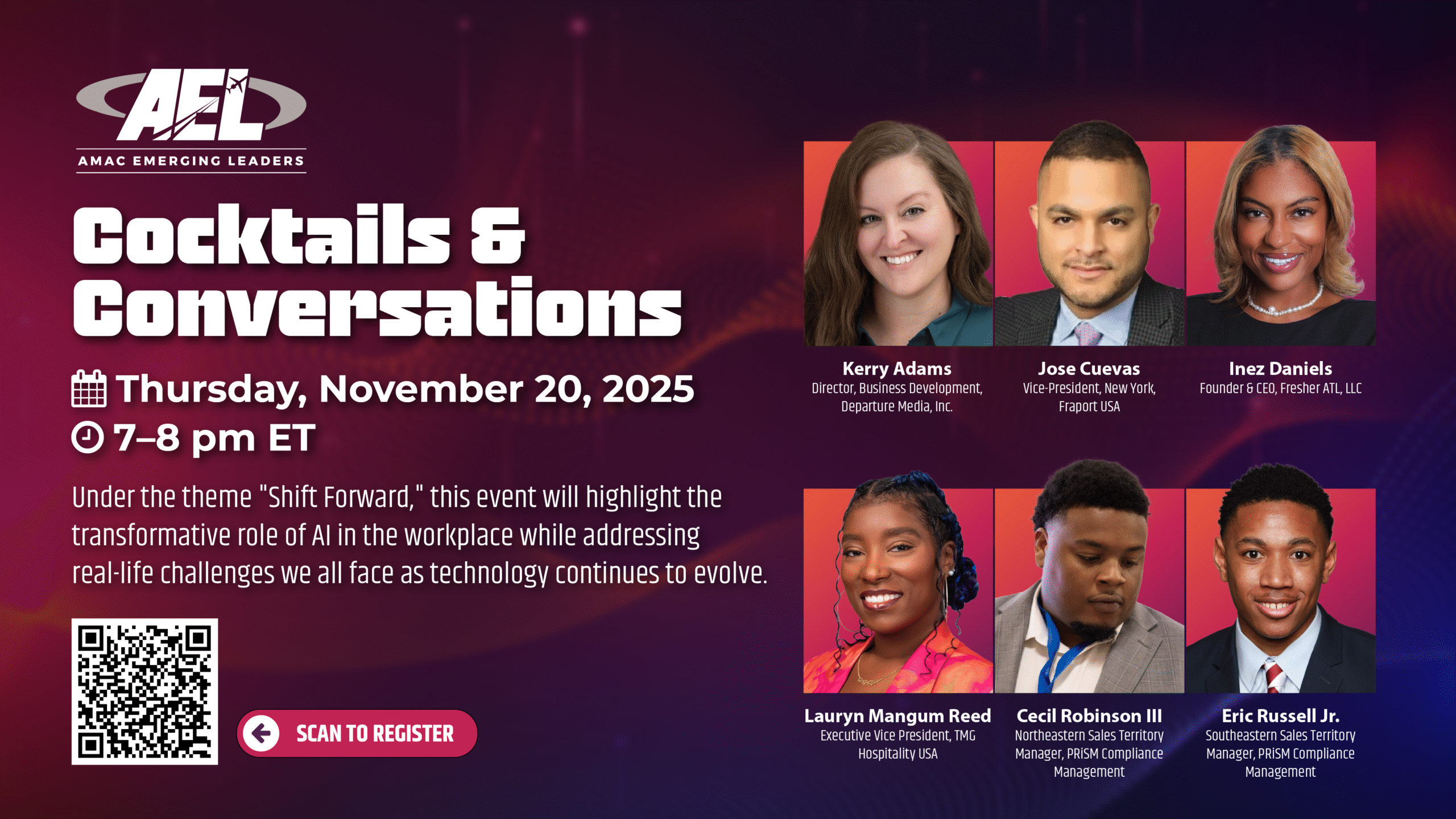 Join the AMAC Emerging Leaders Committee for the final edition of our Cocktails & Conversation series for 2025! This virtual event is an opportunity for open discussion on the evolving intersection of technology, efficiency and well-being. Under the theme “Shift Forward,” this event will spotlight the transformative role of AI in the workplace while addressing real-life challenges we all face as technology evolves — staying connected, protecting our well-being, and ensuring that people remain at the heart of innovation.