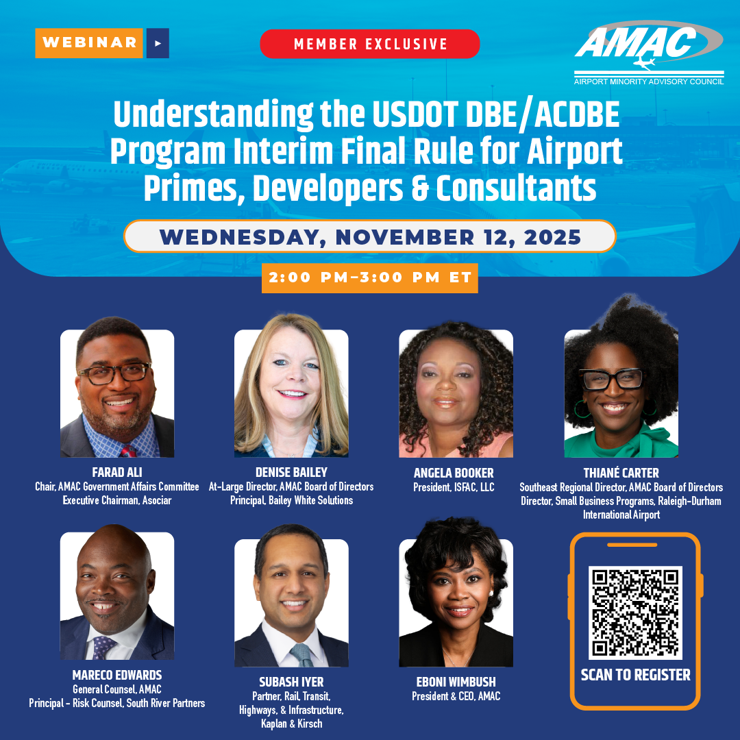 Designed for Airport Primes, Developers, Consultants, and firms providing certification or supportive services to airports, as well as DBE/ACDBE firms, this webinar will help AMAC members understand the USDOT DBE/ACDBE Program Interim Final Rule and its implications for federally funded airport projects and concessions opportunities. Attendees will gain insight into key changes affecting certification, compliance and contracting, as well as strategies for maintaining strong partnerships under the updated requirements.