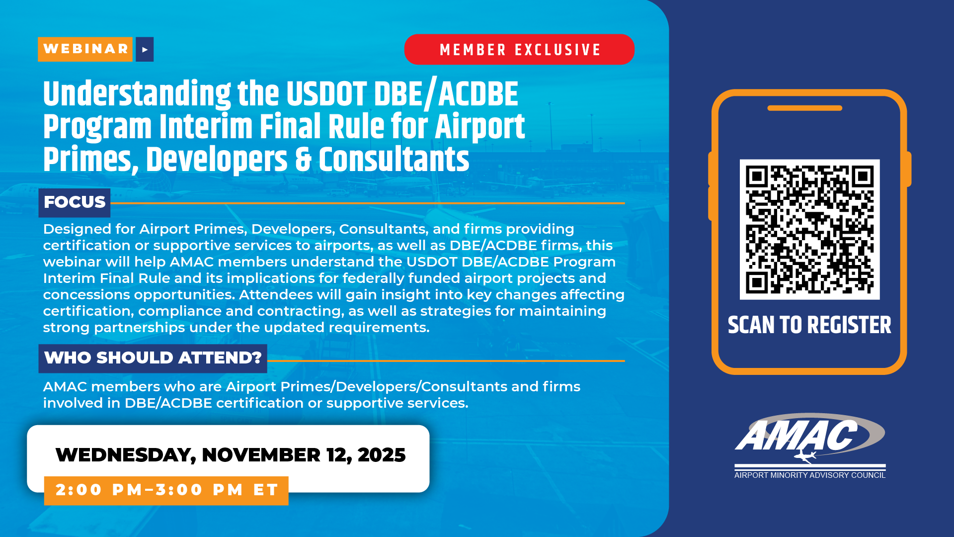 Designed for Airport Primes, Developers, Consultants, and firms providing certification or supportive services to airports, as well as DBE/ACDBE firms, this webinar will help AMAC members understand the USDOT DBE/ACDBE Program Interim Final Rule and its implications for federally funded airport projects and concessions opportunities. Attendees will gain insight into key changes affecting certification, compliance and contracting, as well as strategies for maintaining strong partnerships under the updated requirements.