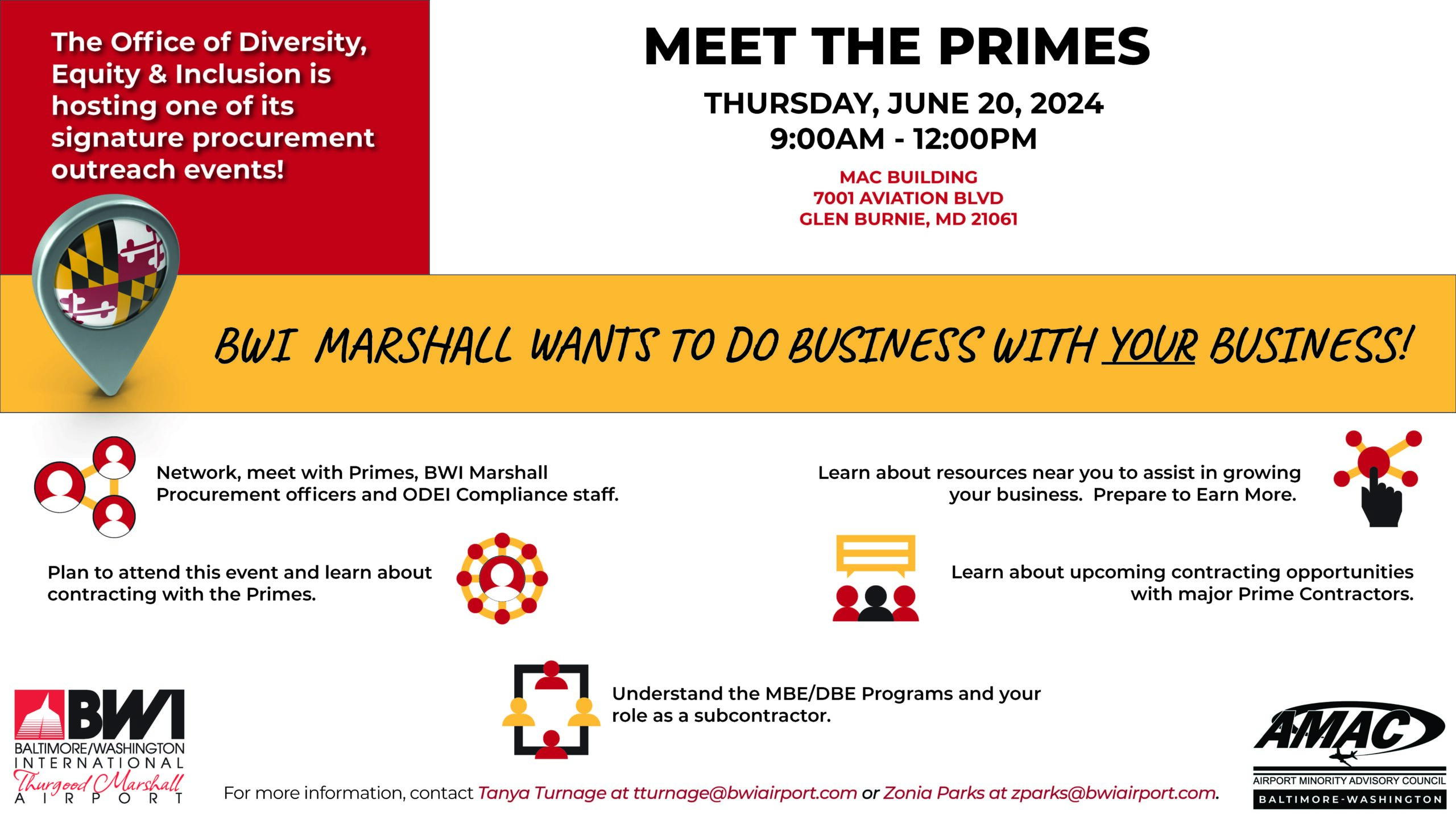 BWI Meet the Primes Outreach Event + Add to Google Calendar + iCal / Outlook export The event is finished. Date Jun 20 2024 Expired! Time 9:00 am - 12:00 pm Location MAC Building 7001 Aviation Blvs Glen Burnie, MD 21061 Category AMAC Baltimore/Washington, DC Chapter AMAC Members Feature Event Industry Organizer Baltimore/Washington International Thurgood Marshall Airport Website https://www.bwiairport.com/ Share this event