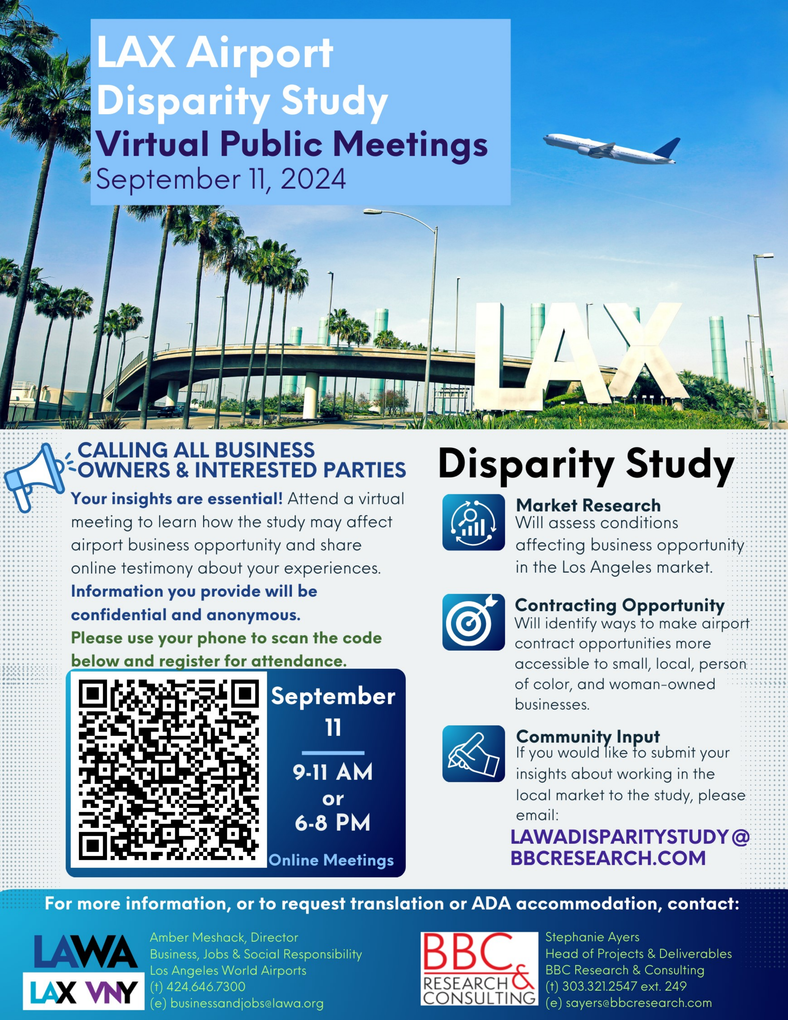 Attention Business Owners and Stakeholders: Your input is crucial! The Study Team seeks your feedback on local market experiences to help LAWA expand contract opportunities. LAWA highly encourages participation in these meetings. Please register here.