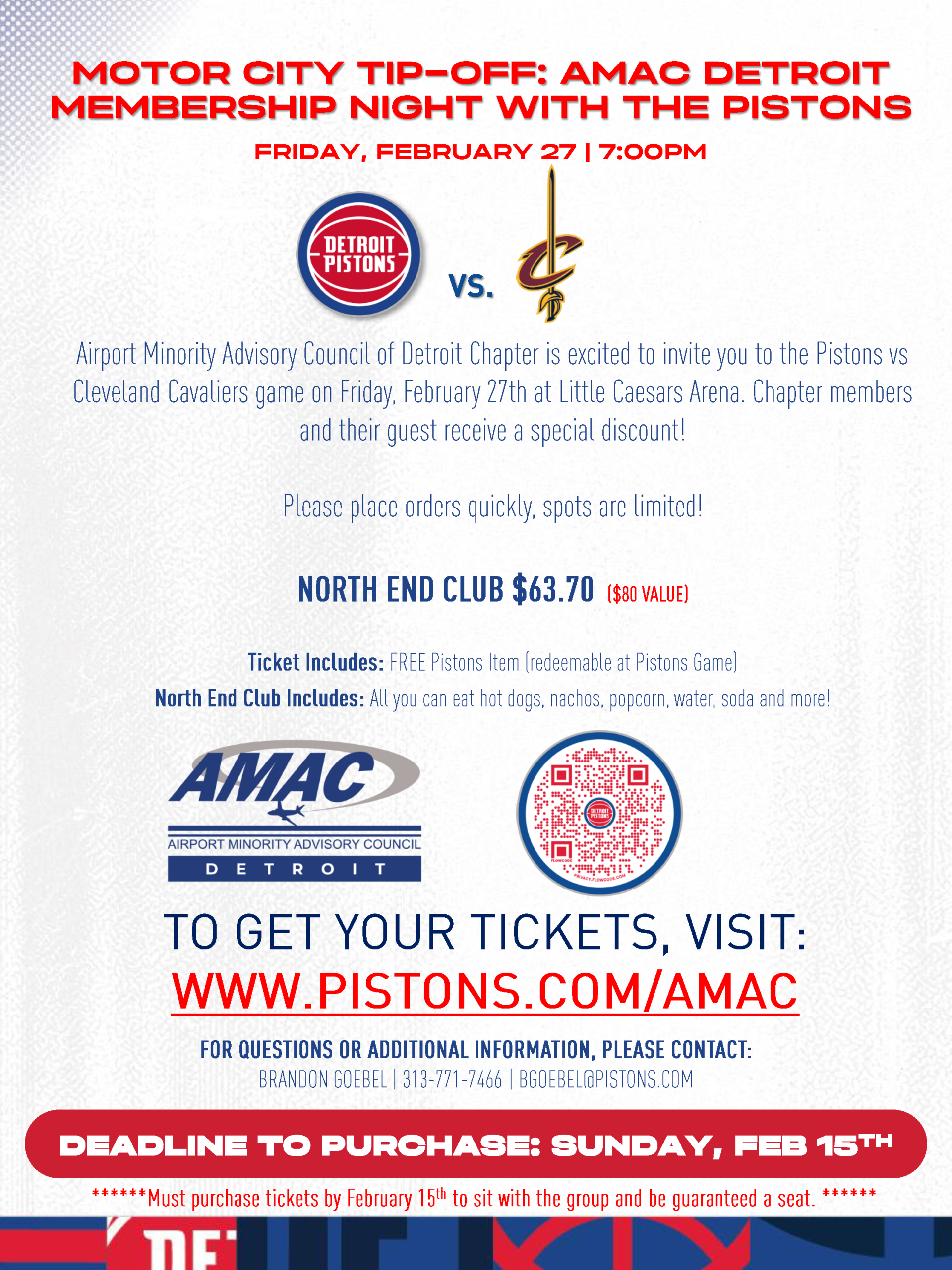 Motor City Tip-Off: AMAC Detroit Chapter’s Membership Night with the Pistons + Add to Google Calendar + iCal / Outlook export 00 days 00 hours 00 minutes 00 seconds Date Feb 27 2026 Time (Eastern Time) 7:00 pm - 10:00 pm More Info REGISTER Location Little Caesars Arena 2645 Woodward Ave, Detroit, MI 48201 Category AMAC Detroit Chapter AMAC Members Industry Organizer AMAC Detroit Chapter REGISTER Share this event