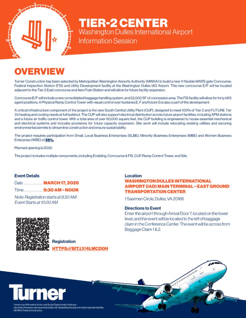 This session will provide an opportunity for small and local businesses to learn more about the project, upcoming opportunities, and how to engage with Turner as the project progresses.