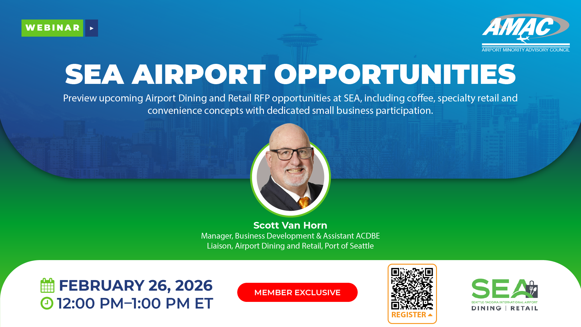 Explore what’s ahead for the Airport Dining and Retail Program at Seattle-Tacoma International Airport (SEA) and learn how to position your business for success! Get an inside look at upcoming Request for Proposal opportunities, including coffee, specialty retail and convenience concepts with dedicated small business participation.