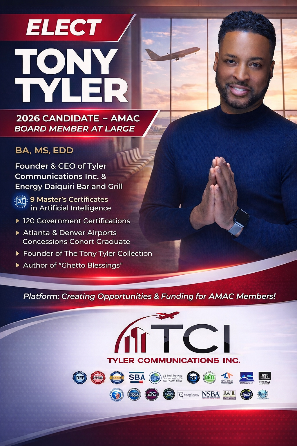 I am honored to be a candidate for At-Large Director with AMAC. As a certified ACDBE, DBE, SBE and MBE firm, Tyler Communications Inc. has been actively engaged in delivering technology solutions to the public and private sector and restaurant and bar owner since 2009.